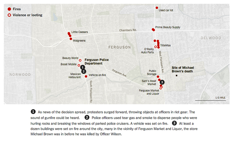 The decision not to indict Mr. Wilson set off a wave of anger among those who had gathered outside the Ferguson Police Department. As the night wore on, the situation grew more intense. Buildings were set on fire, and looting was reported in several businesses.